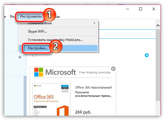 » — должны показываться зелёные индикаторы, когда вы говорите в микрофон. Если всё нормально, тогда прейдите к настройкам микрофона в скайпе. Зайдите в настройки скайпа, как показано на рисунке.