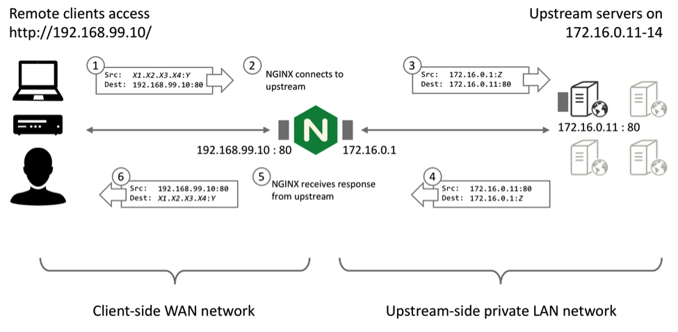 A consequence of this standard reverse proxy mode of operation is that the upstream server observes that TCP and UDP traffic originates from the local NGINX Plus proxy.