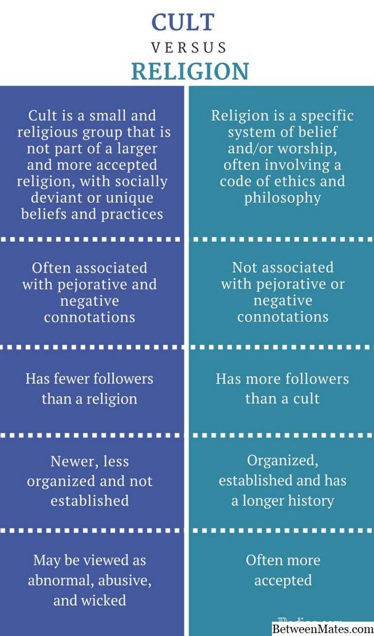Культ против религии На протяжении всей истории человечества людям было естественно поклоняться чему-то. Сначала был анимизм, и в конечном итоге он превратился в основные мировые религии, которые мы имеем сегодня. Некоторые люди утверждают, что сегодня в мире существует около десятка основных религий, в то время как другие говорят, что есть сотни