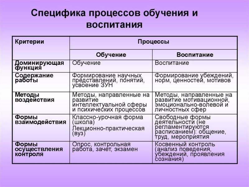 Основные отличия обучения и воспитания проявляются по следующим направлениям: