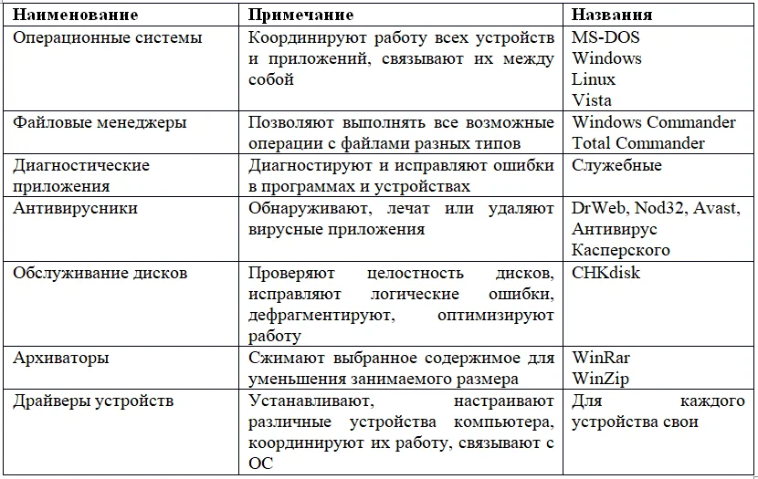 Состав приложений этой группы: базовые (идут по умолчанию с компьютером) и сервисные (их устанавливают дополнительно).