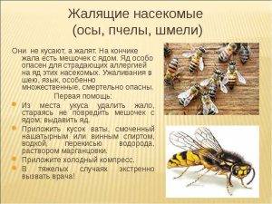 | Пчёлы | После ужаления особь погибает, жало остаётся внутри тела. Боль сильная, но после извлечения жала стихает, припухлость и краснота остаются. |