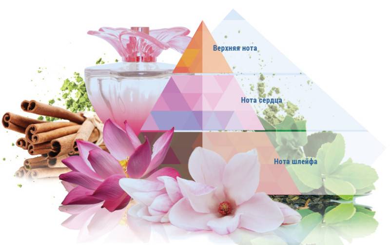 - базовые ноты («шлейф»). Средние ноты мягко помогают зазвучать шлейфу аромата, составляющему 40-50% всей ароматической композиции. Смешиваясь с сердечными, базовые нюансы раскрывают всю полноту запаха и остаются на коже до 8-10 часов, отвечая за «послевкусие» парфюма. Как правило, ноты шлейфа представляют собой тяжелые насыщенные запахи – амбру, мускус, ваниль, кожу, а также различные смолы.