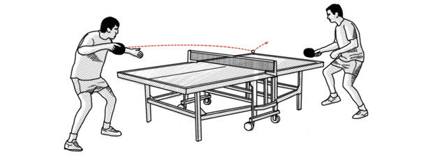 Суть игры – не дать мячу упасть на пол и не допускать два отскока мяча от стола.