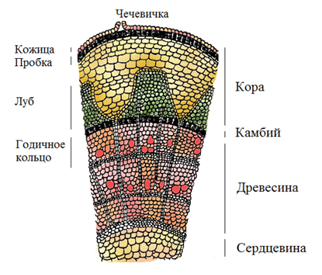 Рост стебля в высоту обеспечивает верхушечная почка, в толщину – камбий. Необходимо знать строение стебля в разрезе. Наиболее хорошо оно прослеживается в стволах деревьев.