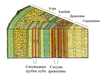 Еще глубже залегает древесина (ксилема) — проводящая ткань, обеспечивающая восходящий ток к листьям воды и минеральных солей.