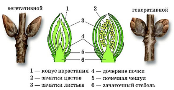 По назначению выделяют вегетативные и генеративные почки. Они отличаются как по внешнему виду, так и по внутреннему строению.