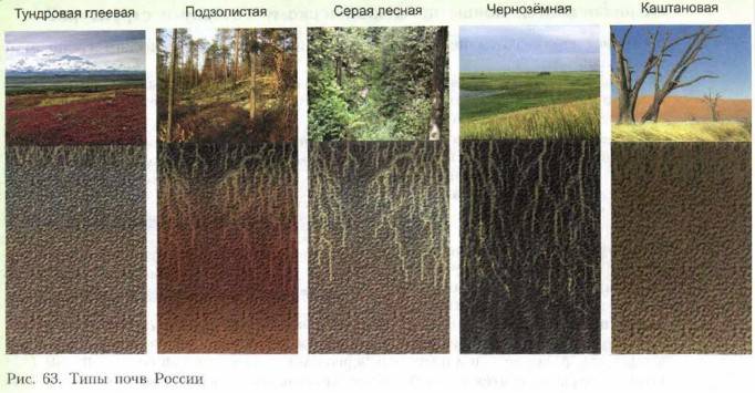 Рассмотрите рисунок 63. В тундре в условиях избыточного увлажнения (К > 1) и недостатка тепла образуются тундровые глеевые почвы. Эти почвы содержат мало перегноя, залегают тонким, большей частью не сплошным слоем, сильно переувлажнены. Переувлажнение препятствует доступу кислорода в средний и нижний горизонты, поэтому в почве образуются недоокислённые соединения железа, придающие её среднему слою голубую окраску. В почвоведении этот сизо-голубой с ржавыми пятнами горизонт получил название глеевого.