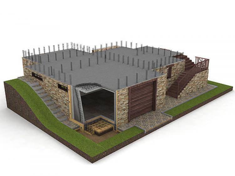 В возведении стен используются те же материалы, что и при строительстве подвального помещения. При обустройстве пола выполняют подушку из бетона толщиной 15-25 см и поверх нее укладывают гидроизоляционный слой. Вокруг этажа нужно сделать полосу из асфальта или бетона с наклоном к земле. Данное решение применяется для предотвращения попадания воды в помещение в период дождей или таяния снега