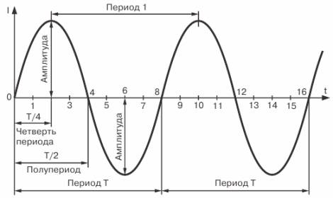 Так как переменный ток меняется по закону синусоиды, то он имеет такие параметры как период полного цикла, время которого обозначается буквой Т. Частота переменного тока обратна периоду полного цикла. Частота переменного тока выражается числом полных периодов в определенный промежуток времени (1 сек).