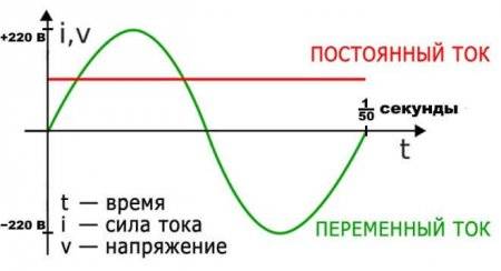 Переменный ток (Alternative Current – AC) отличается от постоянного (Direct Current – DC) тем, что у последнего электроны (носители заряда) всегда движутся в одном направлении. Соответственно отличием переменного тока является то, что направление движения и его сила зависят от времени. Например, в розетке направление и величина напряжения, соответственно и сила тока, изменяется по синусоидальному закону с частотой в 50 Гц (50 раз за секунду изменяется полярность между проводами).