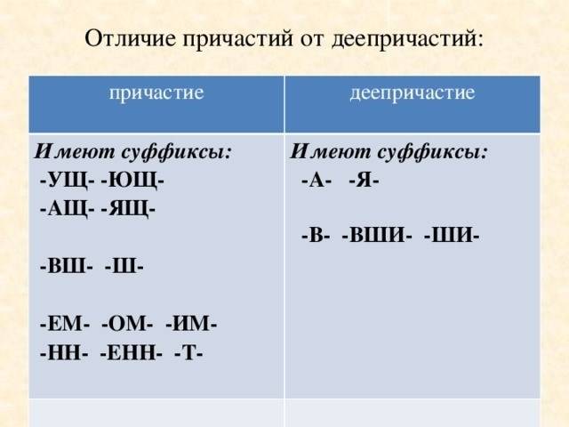 В чем отличия между причастиями и депричастиями? Оо все отличия надо .