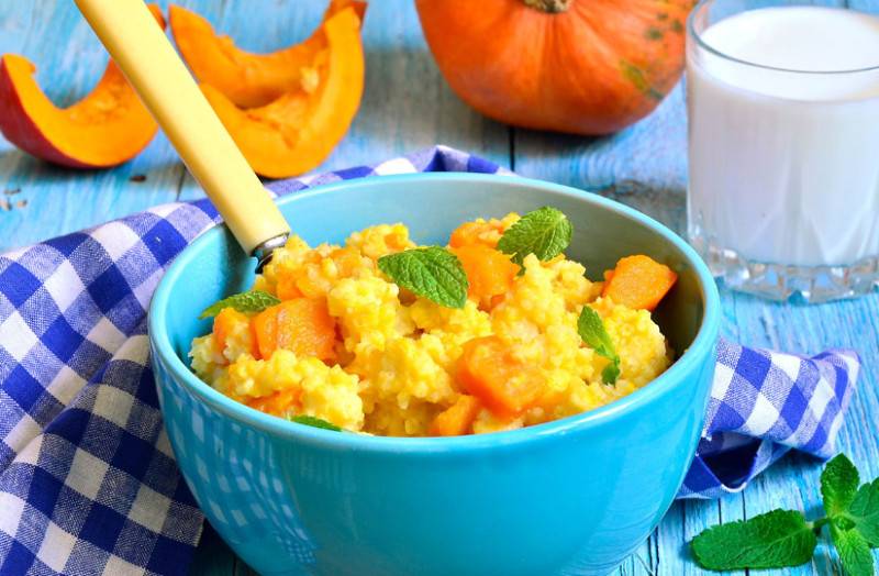 Очистите от семян и кожуры тыкву и нарежьте небольшими кубиками одинакового размера. Крупу промойте и ошпарьте кипятком, чтобы блюдо не горчило. В большую кастрюлю вылейте молоко, поставьте на плиту и доведите до кипения. В кипящее молоко добавьте тыкву и варите 5 минут на среднем огне. Далее высыпьте в кастрюлю пшено и немного посолите. Убавьте огонь и варите еще 10 минут. Регулярно помешивайте, чтобы каша не пригорела. В конце варки добавьте мед или сахар.