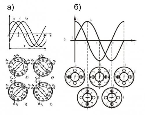 По принципу работы конденсаторный электродвигатель, как отмечалось выше, относится к асинхронным – движение осуществляется за счет создания электромагнитного поля обмотками статора, сдвинутыми относительно друг друга на 90 градусов. Единственное отличие от трехфазных асинхронных электродвигателей заключается во включенном в цепь конденсаторе, через который включаются вторая обмотка электродвигателя.