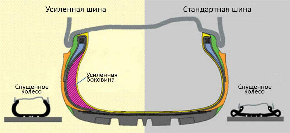 Стоит отметить, что Run Flat – это общее обозначение технологии беспрокольных шин. Производители же зачастую используют свое обозначение такой резины, что создает определенную путаницу.