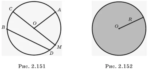 На рисунке 2.151 изображена окружность с центром в точке O. Отрезок OA — радиус окружности, BD — строка окружности, а CM — диаметр окружности.