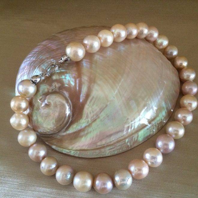 - Основной цвет пресноводной бусины – молочный. Можно встретить жемчужины серого, бежевого, коричневатого и даже зеленоватого оттенков. Вероятность найти черный или розовый речной жемчуг равна нулю. Такие цвета – только у минерала из соленых вод.