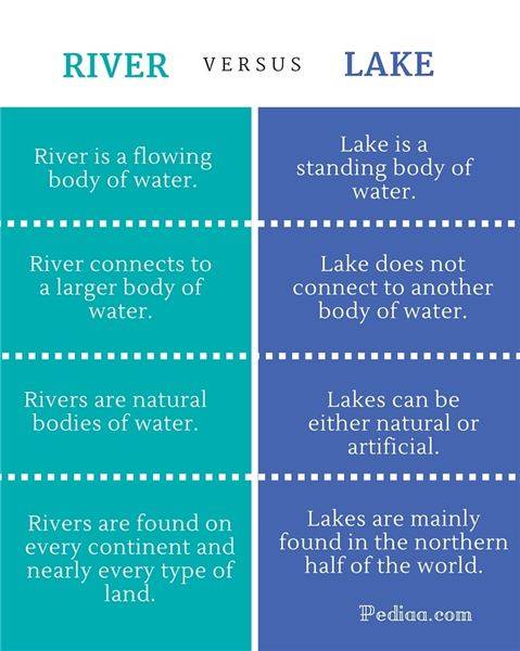 В некоторых местах реки могут быть настолько широкими, что нельзя увидеть противоположный берег. Реки и озера имеют много сходств между собой. Их относят к водам суши, и они являются источниками пресной воды. Река представляет собой постоянный поток воды, который движется в своем русле. У озера такое движение отсутствует. Главные отличия между ними заключаются в следующем: