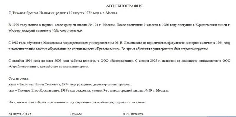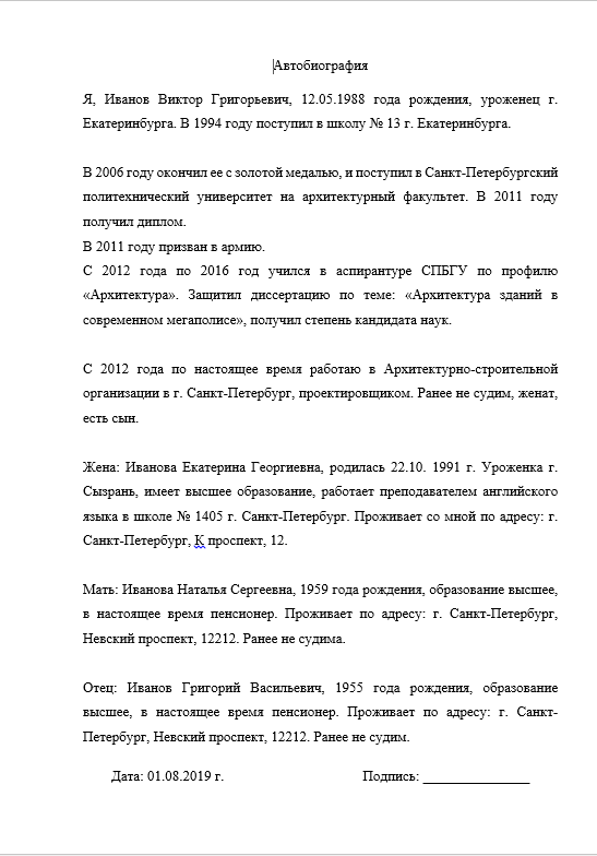 Надеемся что этот образец написания автобиографии поможет вам написать свою автобиографию. К примеру, список документов, необходимых при трудоустройстве, есть в о необходимости представления сведения о последних местах работы государственных и муниципальных служащих говорится в обязательство написания заявления при приеме на работу на должность государственного служащего закреплено для чего нужна автобиография, если вы уже составили резюме? Есть несколько причин прочитав автобиографию, работодатель узнает те сведения, что будут отражаться в станет также ясна картинка о семье, личности, профессионализме, о чем не всегда спросят на собеседовании. То есть, автобиография используется в качестве рекламы своих навыков и способностей, и должна создаваться под требования работодателя пару листов максимум.
