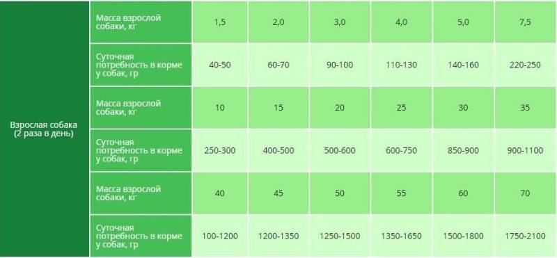 Рацион щенка отличается от рациона взрослой собаки. Также отличается количество кормлений. Взрослая особь должна получать пищу два раза в день, щенок — 3-4, в зависимости от возраста.