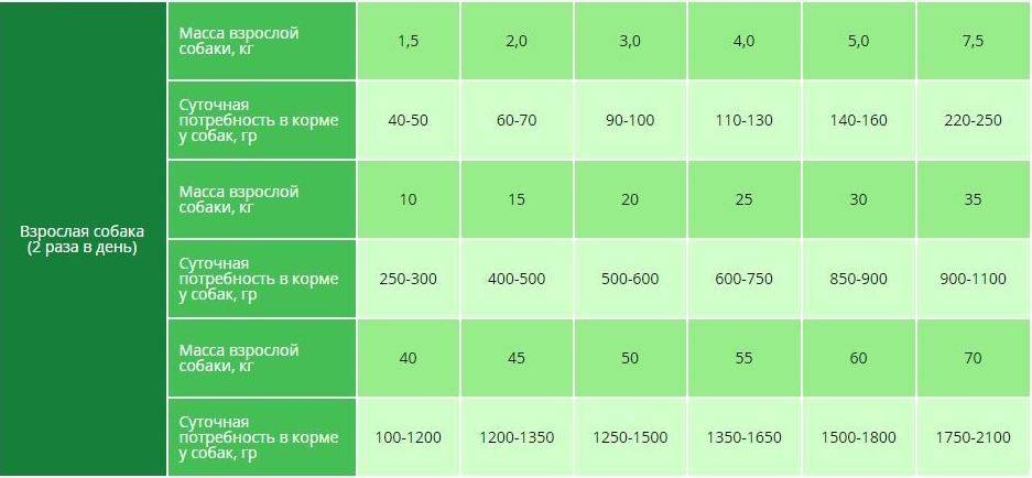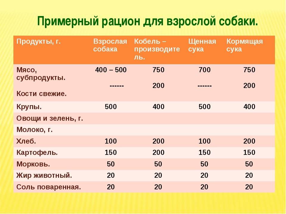 Рацион щенка отличается от рациона взрослой собаки. Также отличается количество кормлений. Взрослая особь должна получать пищу два раза в день, щенок — 3-4, в зависимости от возраста.