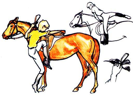 При посадке ухватиться можно за гриву на холке, это удобно, а также не больно для лошади, так как там нет нервных окончаний. Не рекомендуется держаться за седло из-за опасности его перевернуть. Подтяните повод и возьмите его одновременно с гривой.