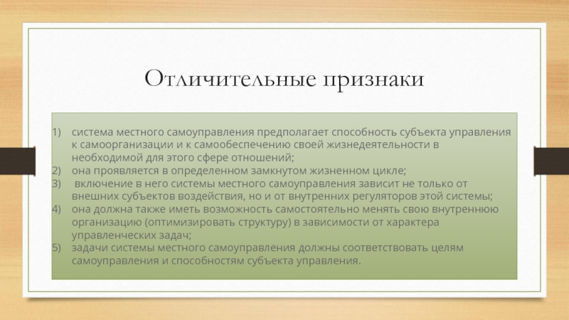 Слайд 6Отличительные признаки система местного самоуправления предполагает способность субъекта управления к