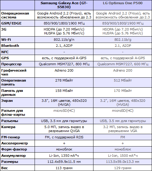По своим характеристикам и цене Galaxy Ace конкурирует с LG Optimus One (P500). Оба этих телефона сравнимы по возможностям. Для наглядности сведем их конфигурации в одну таблицу.