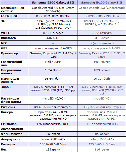 Назвать Samsung Galaxy S III самым совершенным смартфоном на рынке нельзя. Конкуренты представили свои аналоги еще до его анонса. Самым главным его соперником является HTC One X. Однако ниже мы приведем таблицу сравнения с Galaxy S II, поскольку именно с ним пойдет сравнение по производительности. К тому же интересно посмотреть, как эволюционируют флагманы.