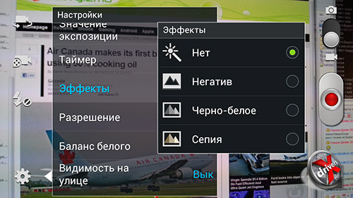 Доступны различные эффекты: негатив, черно-белая съемка, съемка в тонах сепии. Можно настроить экспозицию и задать режим съемки для MMS-сообщения. Пример съемки видео можно посмотреть здесь: