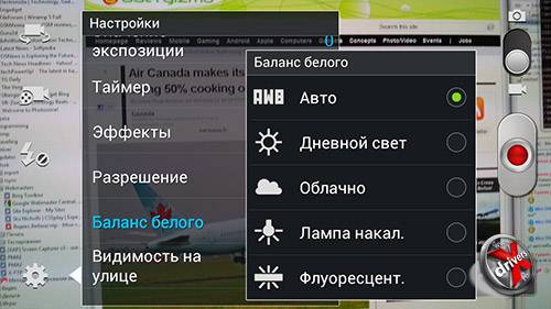 Разрешением съемки может составлять 1920х1080 точек, можно настраивать баланс белого.