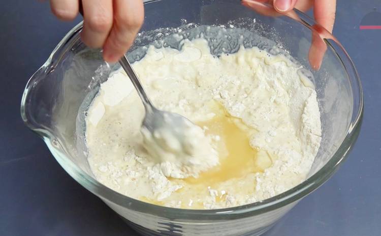 - Добавьте теплую воду и масло, хорошо замешайте тесто.