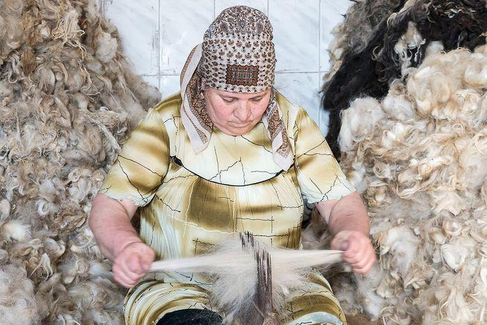 Изготовление нитей из состриженной шерсти животных – процесс кропотливый. Руно вычесывают, отмывают, вытягивают в ровницу. Затем прядут нити, из которых впоследствии изготавливают либо пряжу, либо ткань.