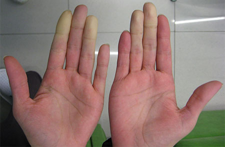 Кончики пальцев белеют, становятся холодными на ощупь, кожа теряет чувствительность. Затем неожиданно парестезия сменяется жжением, ломящей болью, чувством распирания.