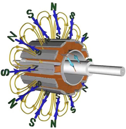 Первый элемент агрегата располагается на статоре. Индуктор размещается на роторе, который отделен от статора воздушной прослойкой. Структура якоря представлена обмоткой (одной или несколькими). Токи, которые подаются в соответствующий элемент двигателя, формируют магнитное поле, вращающееся с заданной частотой и взаимодействующее с полем индуктора. Индуктор включает 2 полюса — в виде постоянных магнитов.