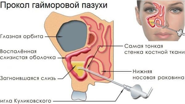 Иногда для лечения гайморита назначают пункцию или прокол. В ходе этой операции под местной анестезией человеку прокалывают пазуху (изнутри рта). Через прокол откачивают гной и промывают воспалённую полость.