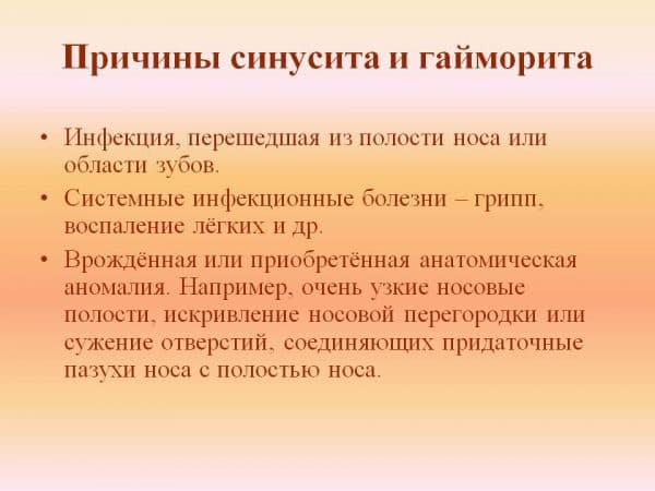 Отоларингологи называют основной причиной, вызывающей воспалительные процессы в гайморовых пазухах, попадание на слизистую различных грибков, аллергенов и инфекций. Кроме того, заболевание может развиться на фоне хронического насморка.