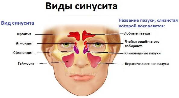 Все придаточные пазухи носа имеют слизистые покровы и могут стать местом воспалительных процессов. Любое воспаление в районе полостей и внутри их (инфекционного, грибкового или аллергического характера) носит название “синусит”. В зависимости от локализации в пазухах различают такие заболевания:
