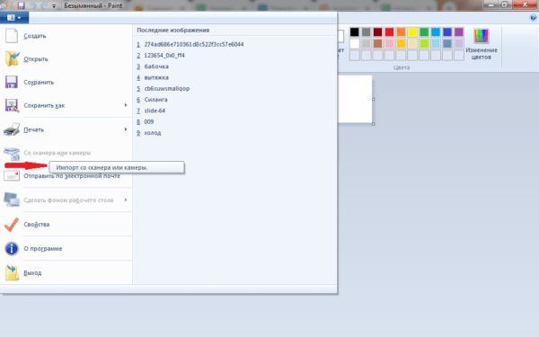 Программа Paint входит в стандартный набор средств Виндовс. Это приложение оснащено поддержкой сканирования. Пользователю достаточно через меню «Пуск» найти приложение в перечне программ и запустить. В открывшемся окне следует открыть вкладу «Файл», где выбрать пункт подменю «Со сканера или камеры». После этого выбрать необходимые для процесса сканирования настройки, а также определить файловый формат для сохранения образа. Инициируется процесс оцифровки нажатием на соответствующую кнопку.
