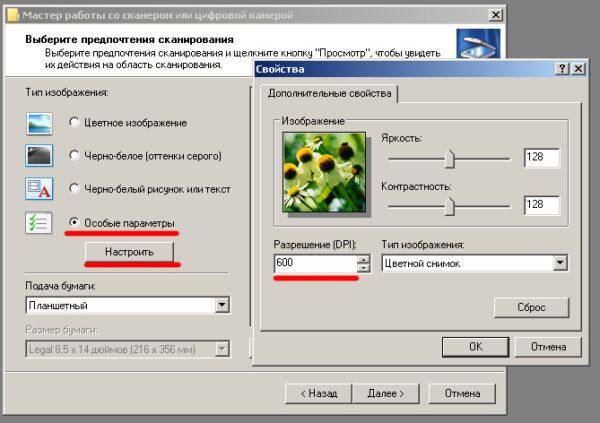 - В открывшемся окне мастера нужно настроить параметры операции: черно-белое, цветное сканирование, яркость, разрешение, путь для сохранения результата и т.д. Здесь в предпросмотре можно увидеть, как будет выглядеть отсканированный документ.