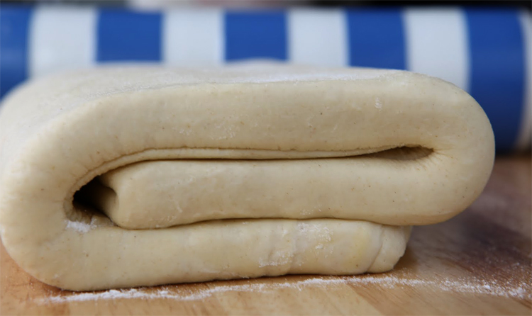 Поднятое тесто разделывается на отдельные порции, которые раскатываются в прямоугольную форму. Затем тонкий слой масла наносится на поверхность теста и оно фолдируется или складывается несколько раз при каждой последующей прокатке. Этот процесс создает слои в тесте, что и объясняет название «слоеное тесто».