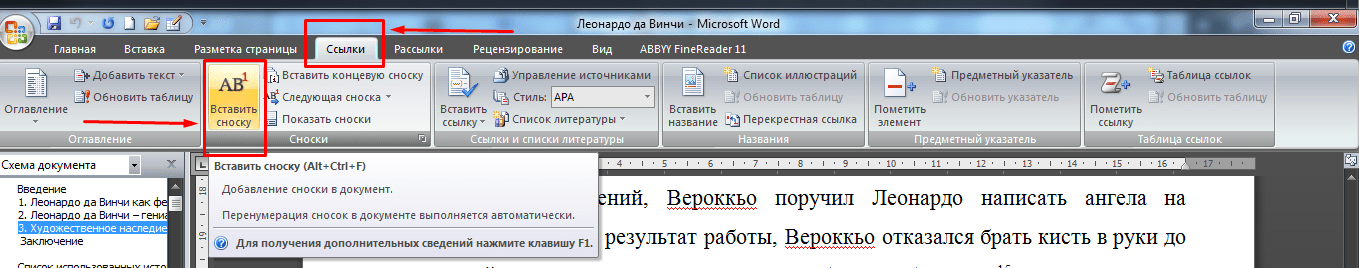 Сноска делается из текста-ссылки, подготовленного в предыдущих шагах.