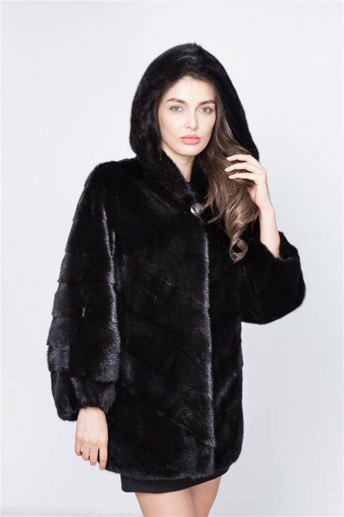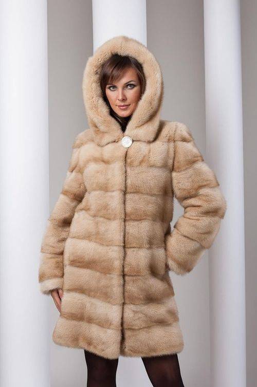 Популярностью у молодежи пользуются модели средней длины с капюшоном. Обычно при пошиве таких изделий используется раскладка шкурок в поперечку.