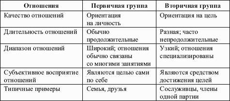 Группы могут быть первичными и вторичными. Первичные группы, как правило, малые. Они характеризуются тесными связями между членами. Во вторичных группах отсутствует тесное взаимодействие, а целостность группы сохраняется благодаря наличию общих целей и интересов.