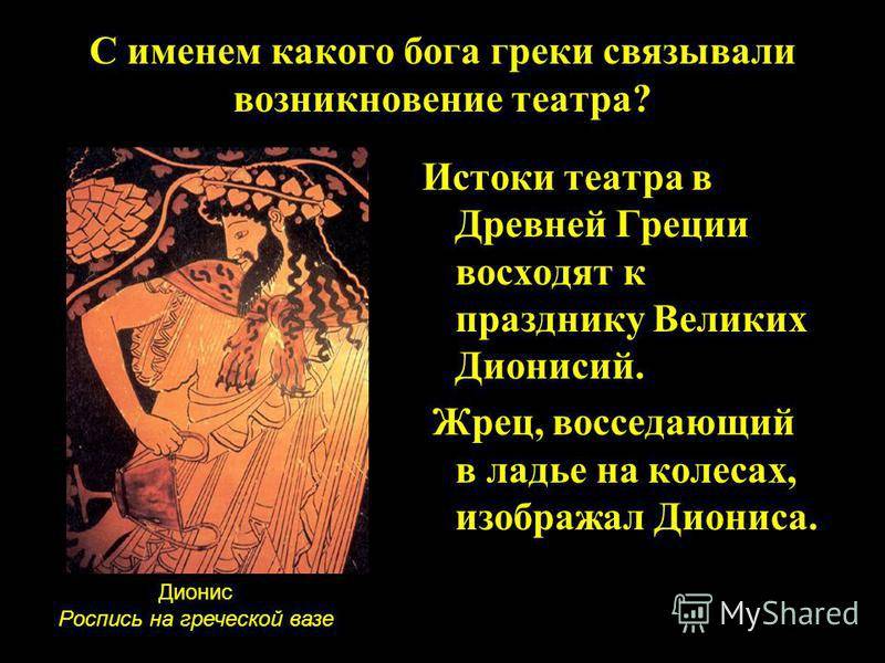 Истоки театра в Древней Греции восходят к празднику Великих Дионисий. Жрец, восседающий в ладье на колесах, изображал Диониса. С именем какого бога греки связывали возникновение театра? Дионис Роспись на греческой вазе