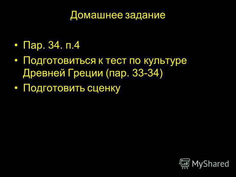 Домашнее задание Пар. 34. п.4 Подготовиться к тест по культуре Древней Греции (пар ) Подготовить сценку