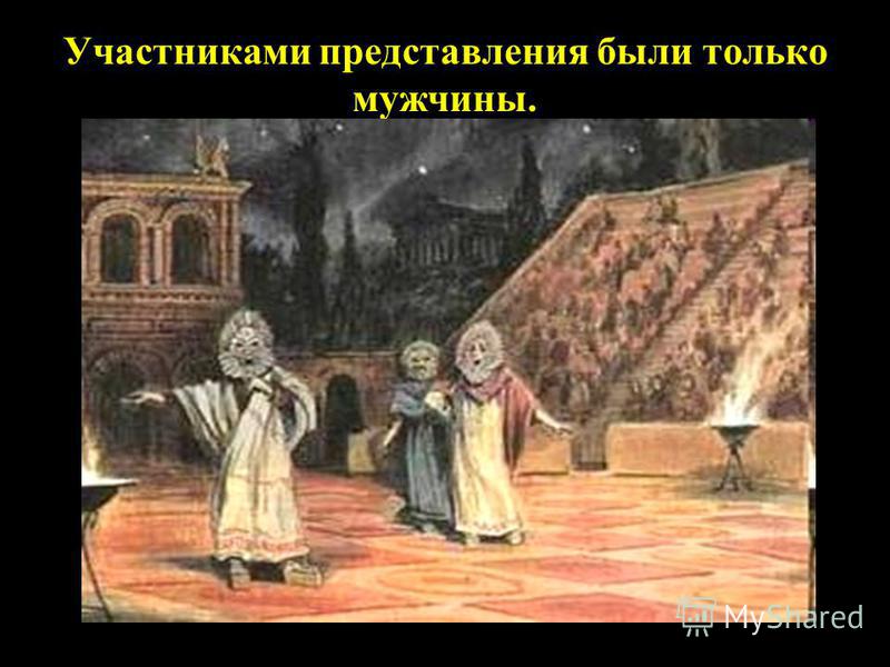 Актёры использовали маски, обувь на толстой подошве. Один человек играл несколько ролей в каждом спектакле. Представления происходили несколько раз в год в особом здании под открытым небом. Греки не устраивали вечерних представлений, так как не было хорошего искусственного освещения. Участниками представления были только мужчины.
