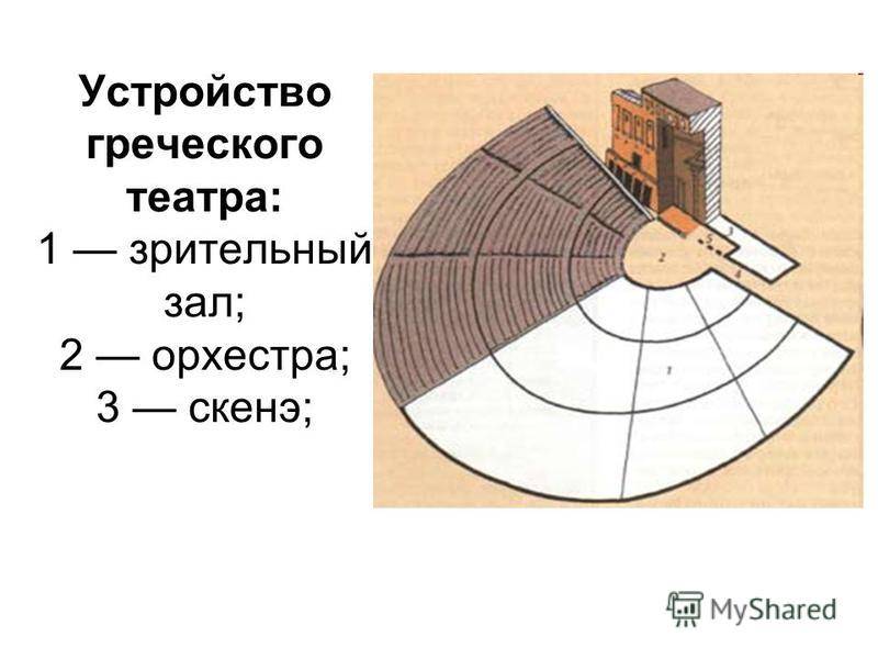 Устройство греческого театра: 1 зрительный зал; 2 орхестра; 3 скене;