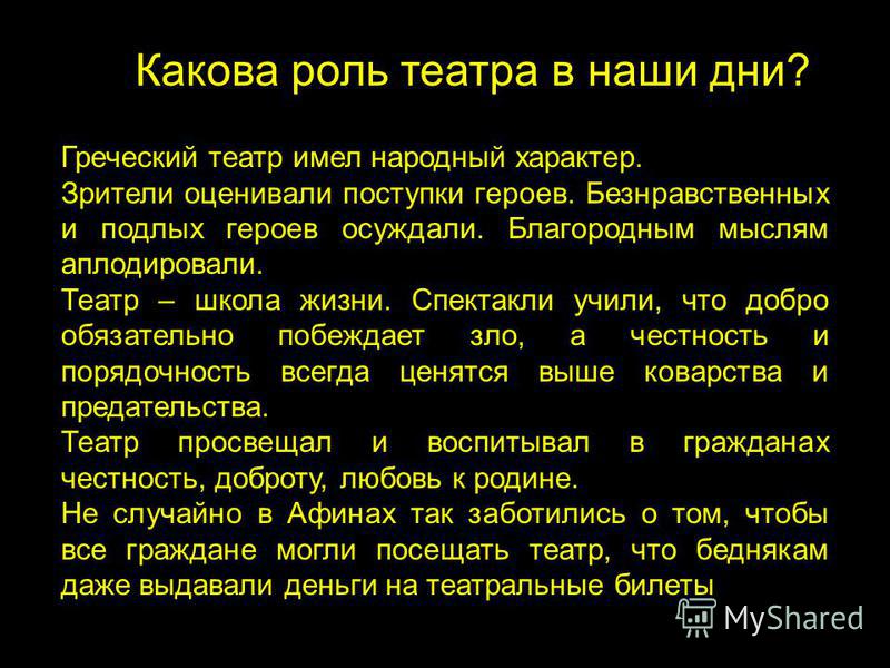 На ваш взгляд, какова роль театра в Древней Греции и в наши дни? Какова роль театра в наши дни? Греческий театр имел народный характер. Зрители оценивали поступки героев. Безнравственных и подлых героев осуждали. Благородным мыслям аплодировали. Театр – школа жизни. Спектакли учили, что добро обязательно побеждает зло, а честность и порядочность всегда ценятся выше коварства и предательства. Театр просвещал и воспитывал в гражданах честность, доброту, любовь к родине. Не случайно в Афинах так заботились о том, чтобы все граждане могли посещать театр, что беднякам даже выдавали деньги на театральные билеты билеты. Греческий театр имел народный характер. Зрители оценивали поступки героев. Безнравственных и подлых героев осуждали. Благородным мыслям аплодировали. Театр – школа жизни. Спектакли учили, что добро обязательно побеждает зло, а честность и порядочность всегда ценятся выше коварства и предательства. Театр просвещал и воспитывал в гражданах честность, доброту, любовь к родине. Не случайно в Афинах так заботились о том, чтобы все граждане могли посещать театр, что беднякам даже выдавали деньги на театральные билеты.