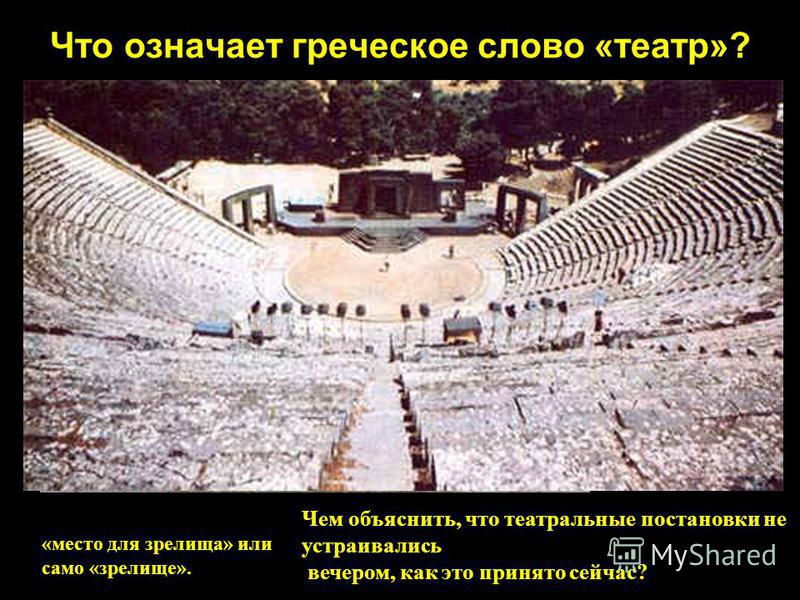 Что означает греческое слово «театр»? «место для зрелища» или само «зрелище». Чем объяснить, что театральные постановки не устраивались вечером, как это принято сейчас?
